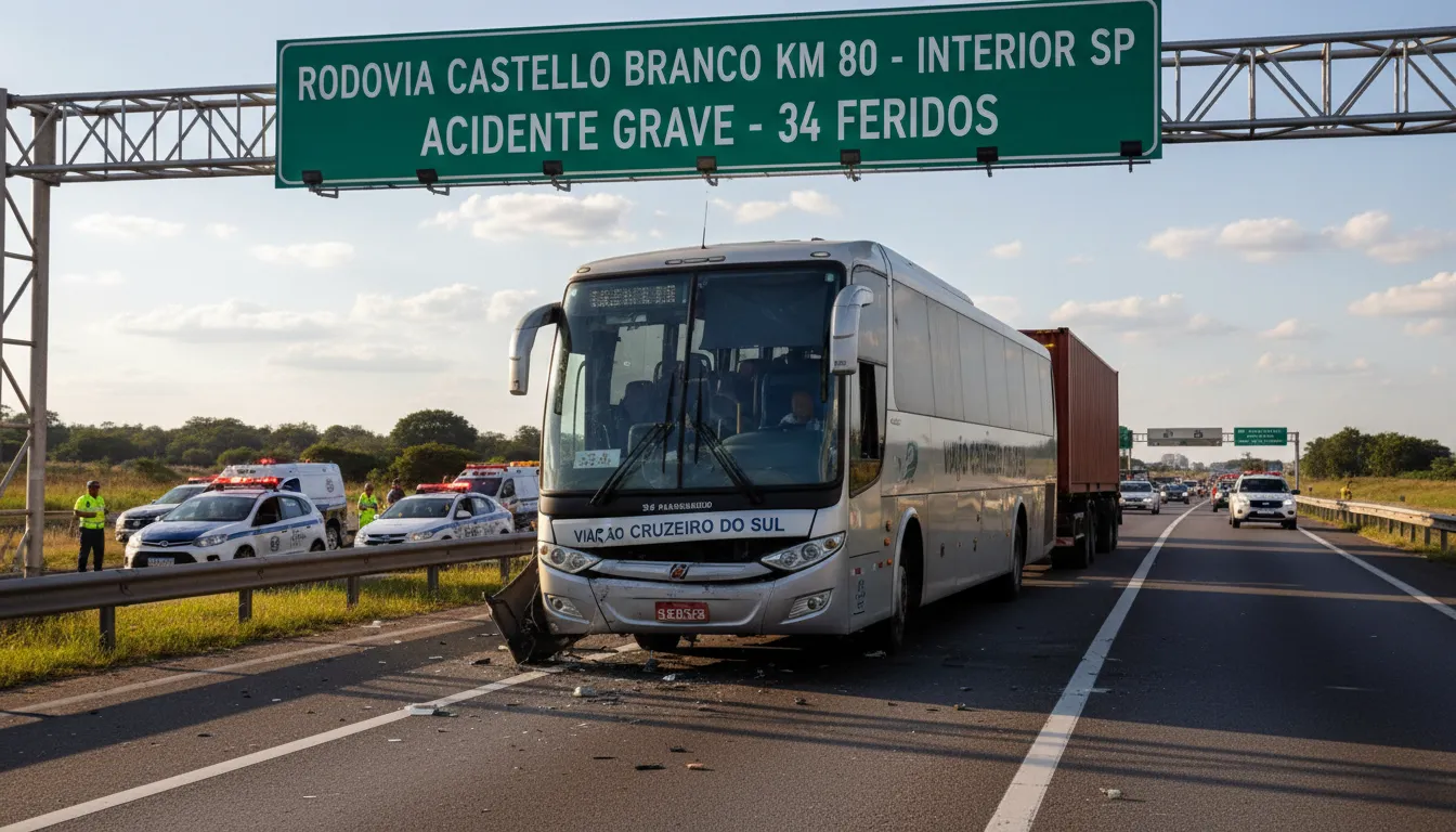 Na noite de quinta-feira (16), um ônibus com 34 passageiros colidiu com a traseira de um caminhão na Rodovia Castello Branco (SP-280), em Bofete, São Paulo. A Agência de Transporte do Estado de São Paulo (Artesp) informou que ambos os veículos seguiam na mesma direção quando ocorreu o acidente, cujas causas ainda serão investigadas. Apesar da destruição na parte frontal do ônibus, não houve feridos, e todos os ocupantes foram retirados em segurança.